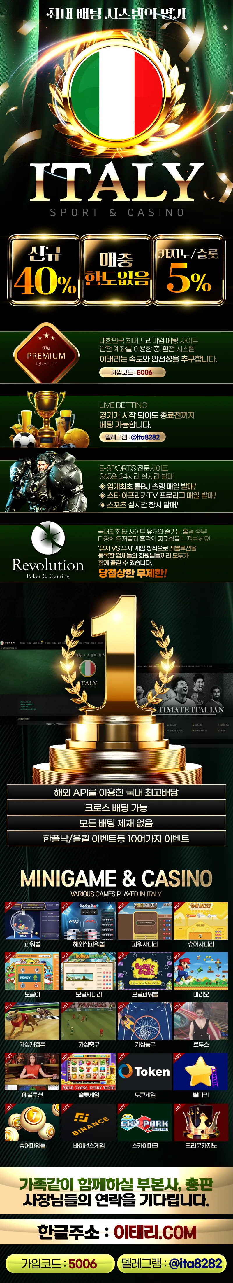 이태리는 불필요한 배팅 제재 없이 자유로운 게임 진행이 가능합니다.